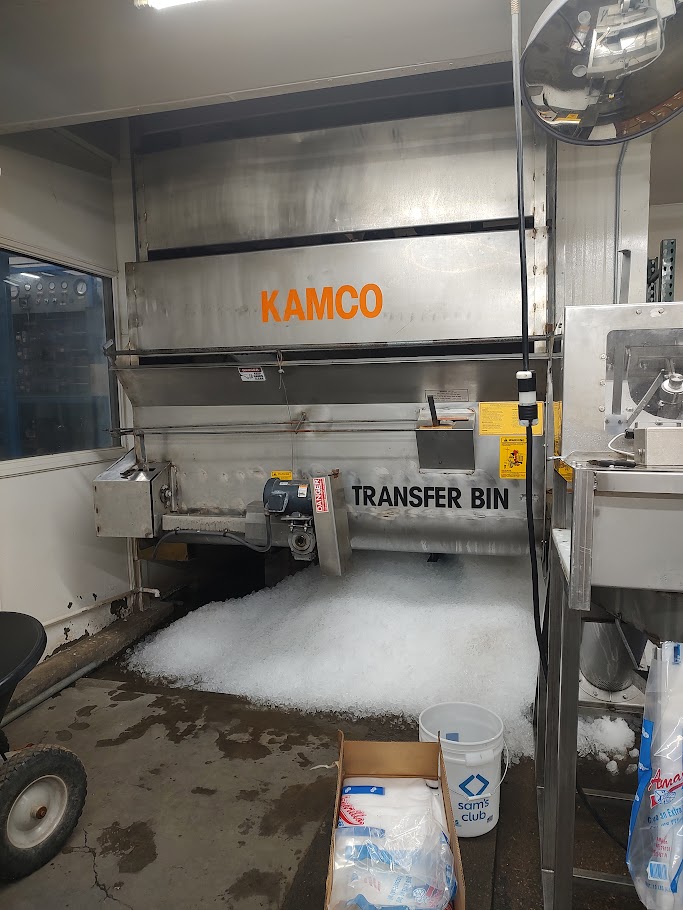 Kamco 16 Ton Steel Side Ice Bin 112T x 92″ W x 19’9 L. Runs great